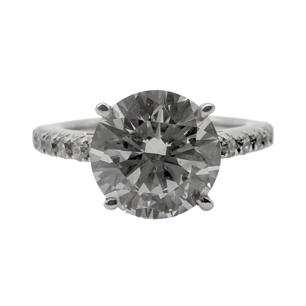 Featuring one lab grown round brilliant cut diamond, weighing 2.30 carat, accompanied by an IGI Diamond Report #LG12612406, stating the diamond is VS2 clarity, H color, set with four prongs in a 14k white gold mounting, decorated by 22 lab grown round brilliant cut diamonds, weighing a total of .44 carat, French set, VS clarity, G to H color, the band is 2.10 mm in width, weighing 3.80 grams, ring size 5 1/2. Note: the center diamond can be sold loose; can be sized.
