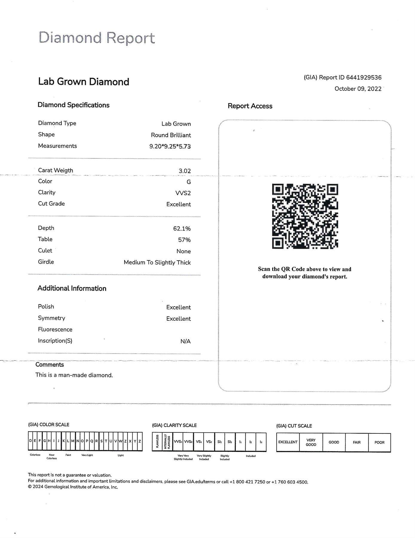 3.02 Carat G VVS2 GIA Lab Grown Diamond Platinum Solitaire Ring