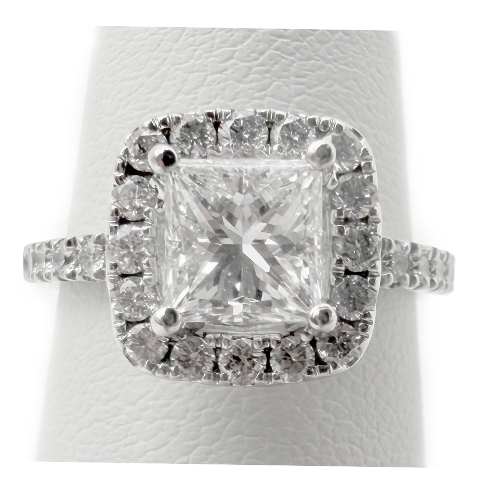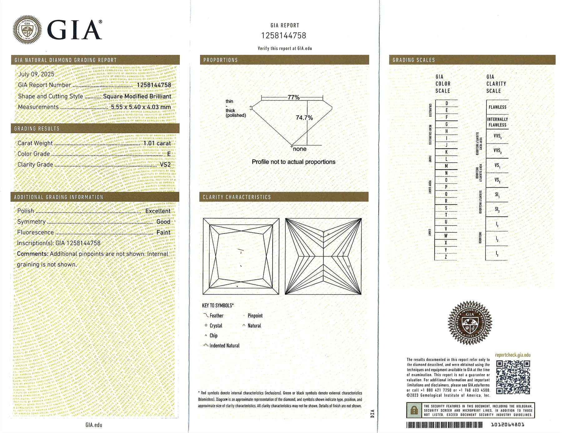 Centering one Princess Cut diamond, weighing 1.01 carat, accompanied by a GIA Diamond Grading Report #1258144758, stating the diamond is VS2 clarity, E color, set in a 14k white gold mounting, the halo, undercarriage & band are decorated by 44 round brilliant cut diamonds, weighing a total of approximately .70 carat, prong set, the band is 2.00 to 1.40 mm in width, weighing 3.30 grams; along with a matching ring jacket, decorated by 30 round brilliant cut, weighing a total of approximately .50 carat, weighing 2.80 grams, all side diamonds are SI to I clarity, G to H color, both ring size 5 1/2. Note: Center diamond can be sold loose; can be sized.