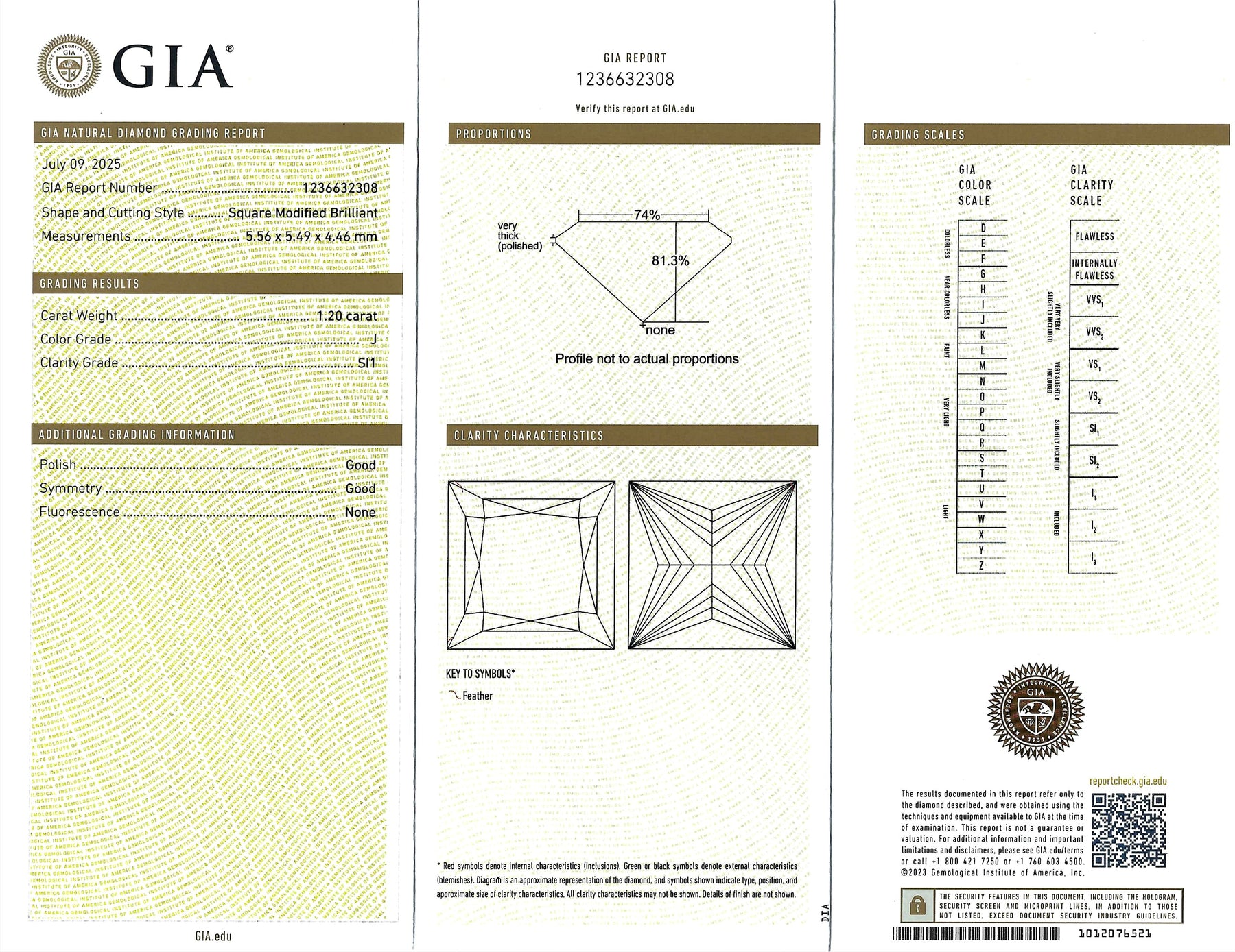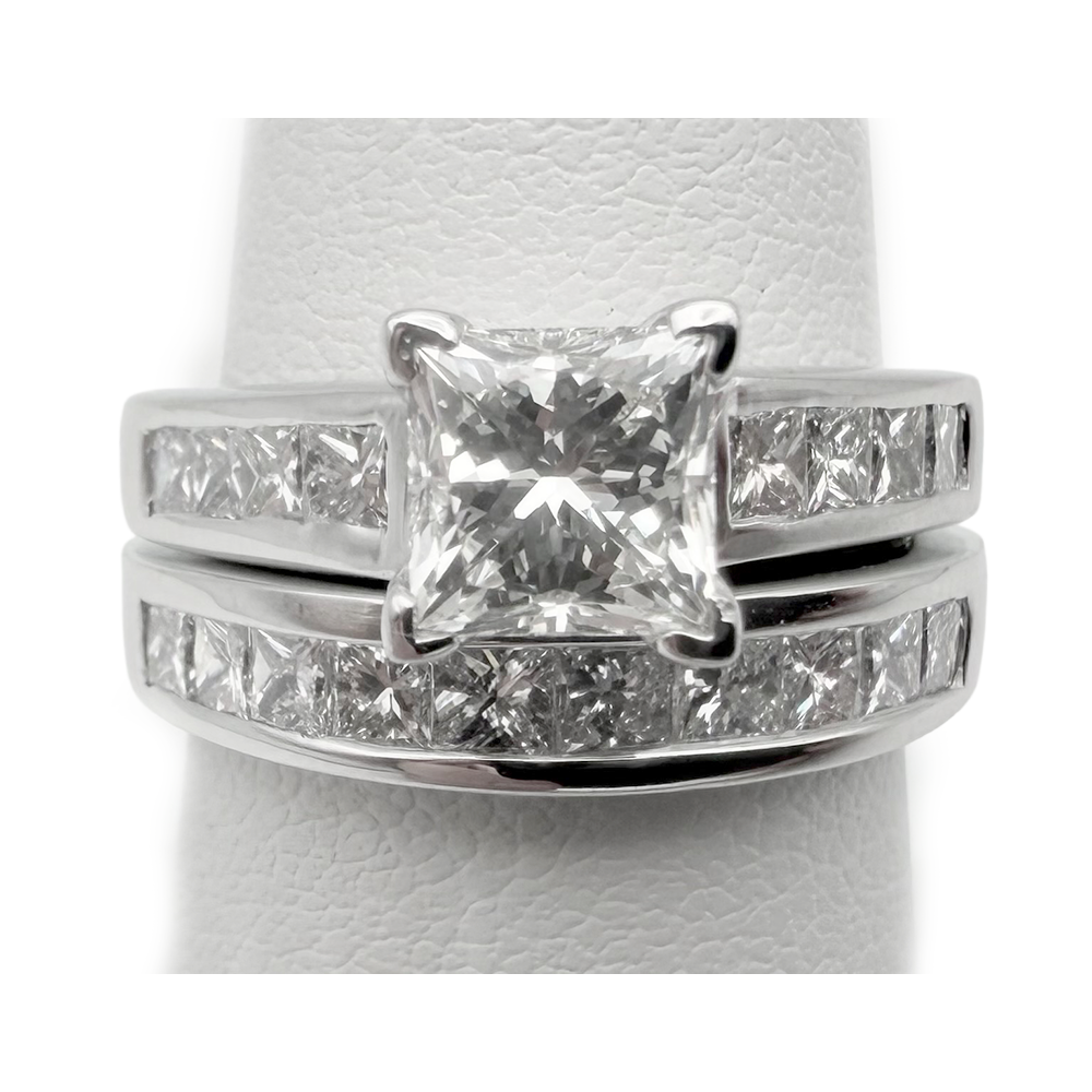 Featuring one princess cut diamond, weighing 1.20 carat, accompanied by a GIA Diamond Grading Report #1236632308, stating the diamond is SI1 clarity, J color, set in a 14k white gold band style ring, decorated by 8 princess cut diamonds, weighing approximately .80 carat, channel set, weighing 4.80 grams; along with a matching diamond, 14k white gold wedding band, decorated by 10 princess cut diamonds, weighing approximately 1.00 carat, channel set, weighing 4.50 grams, all side diamonds are VS to SI clarity, G to H color, both bands graduate from apx 4.00 to 2.70 mm in width. Note: Center diamond can be sold loose; can be sized.