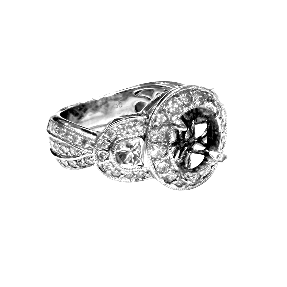 This custom made 18k white gold mounting, decorated by 2 half moon diamond, weighing a total of approximately .30 carat, having a halo of diamonds around the center diamond and diamonds around the half moons and in the band, all 68 weighing a total of approximately .85 carat, VS1 to SI1 clarity, G to H color, weighing 7.30 grams, ring size 5. Note: can be sized