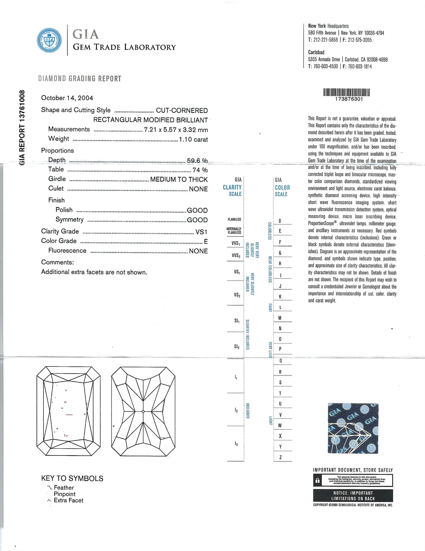 Centering one radiant cut diamond, weighing 1.10 carat, accompanied by a GIA Diamond Grading Report #13761008, stating the diamond is E color, VS1 clarity, enhanced by 2 radiant cut diamonds, both weighing 1.03 carat, VS clarity, E color, all 3 prong set in open basket mountings, completed by a half rounded 3.20 mm band, all weighing 4.90 grams, ring size 6. Note: can be sized, center diamond can be sold loose.