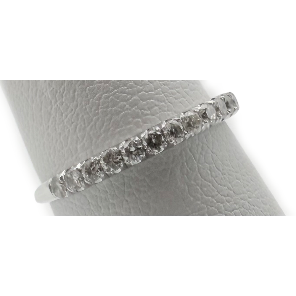 Decorated by 21 round brilliant cut diamonds, weighing a total of .42 carat, SI to I clarity, G to H color, the band is 1.70 mm in width, weighing 1.30 grams, ring size 5 3/4. Note: can be sized.