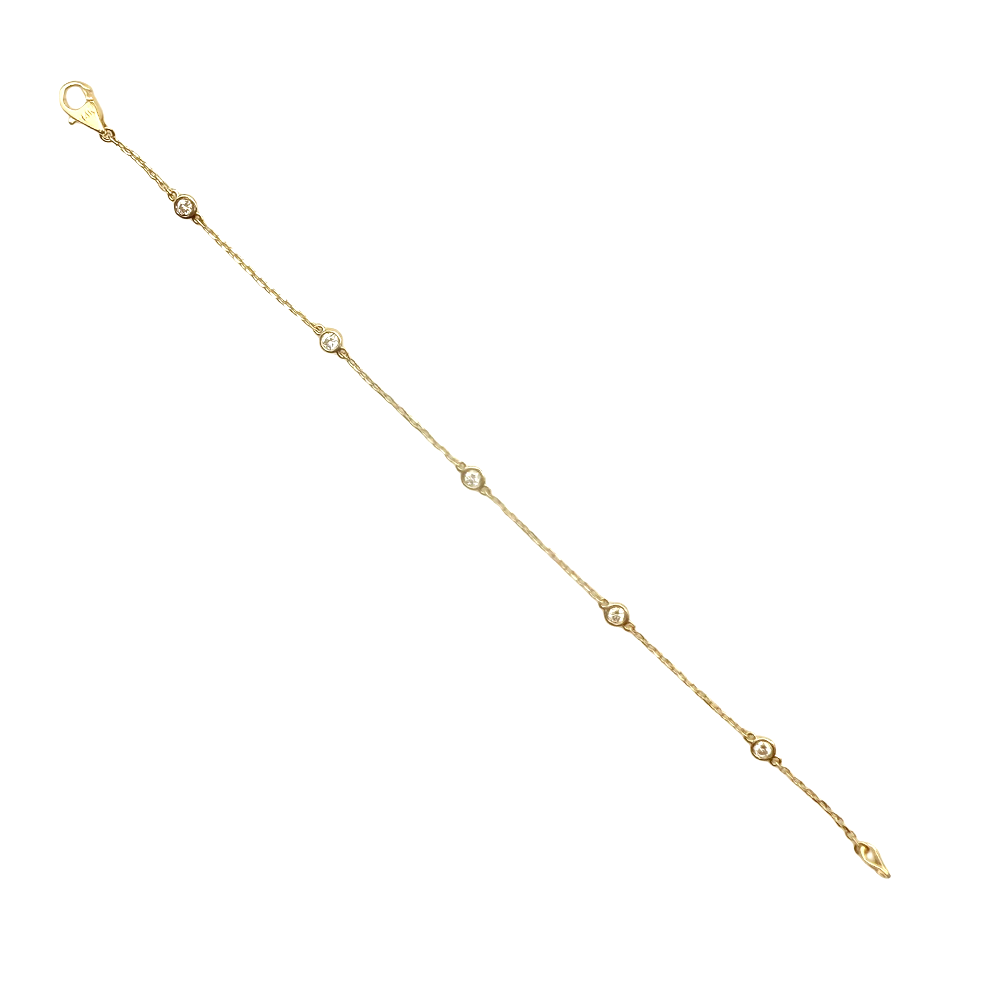 The diamond cut cable link chain is interspaced by 5 round brilliant cut diamonds, bezel set, weighing a total of .40 carat, SI clarity, G to H color, completed by a lobster clasp, measuring 7'' in length, all weighing 1.80 grams.