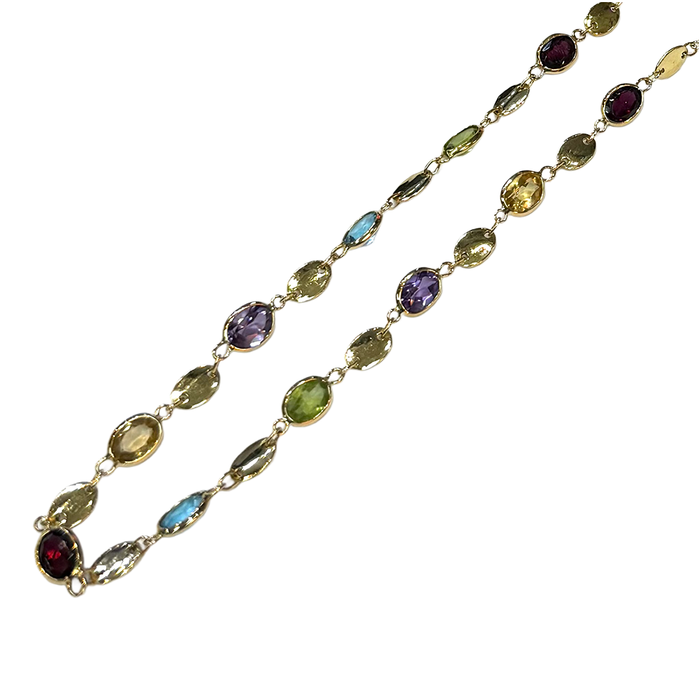 Decorated by 23 oval gemstone, including amethyst, garnet, citrine, blue topaz & peridot, each measuring approximately 7 x 5 mm, individually bezel set, weighing a total of approximately 18 carats, interspaced by 18k yellow gold oval links, completed by a lobster clasp, measuring 20 inches in length, all weighing 14.60 grams.