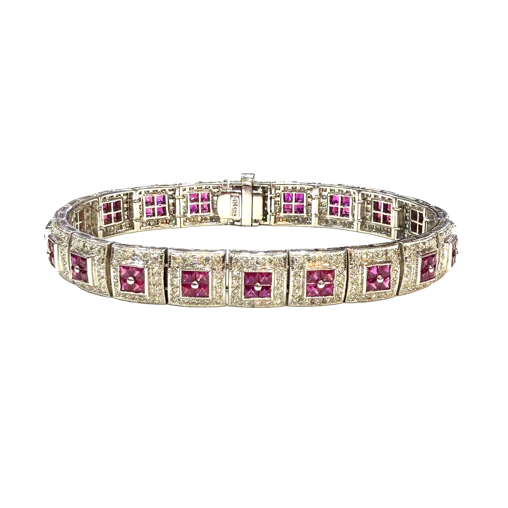 Decorated by 80 French cut rubies, weighing a total of 6.40 carats, along with 320 round single cut diamonds, weighing a total of approximately 2.00 carats, measuring 7 1/4 inches in length, 9.00 mm in width, completed by a push in clasp with an underneath safety bar, all weighing 24.80 grams.