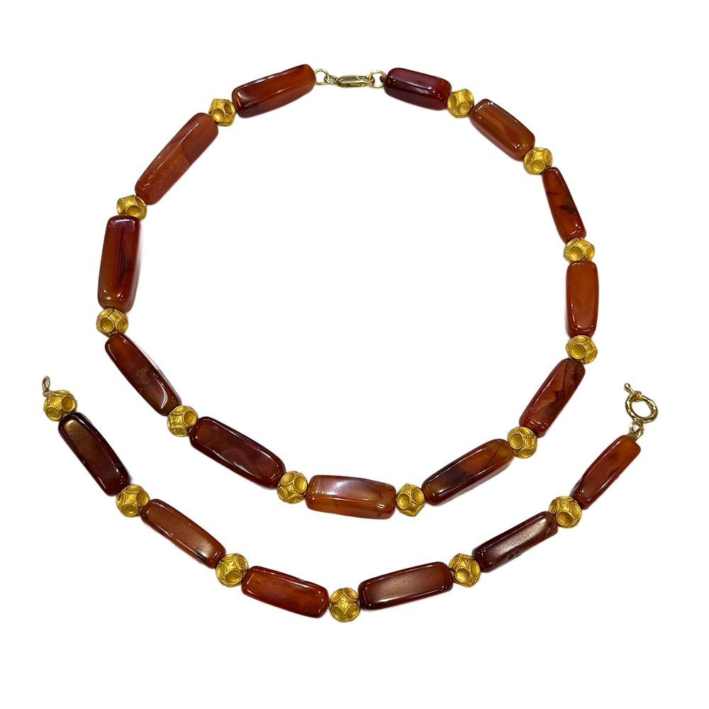 Both have fine quality amber segments, each measuring approximately 1 inch in length & 8 to 9 mm in width, interspaced by 18k yellow gold beads with millgrained edges, measuring 8.50 mm in width, the choker necklace is 15 inches in length completed by a lobster clasp, the bracelet is 7 3/4 inches in length, completed by a spring hook clasp.