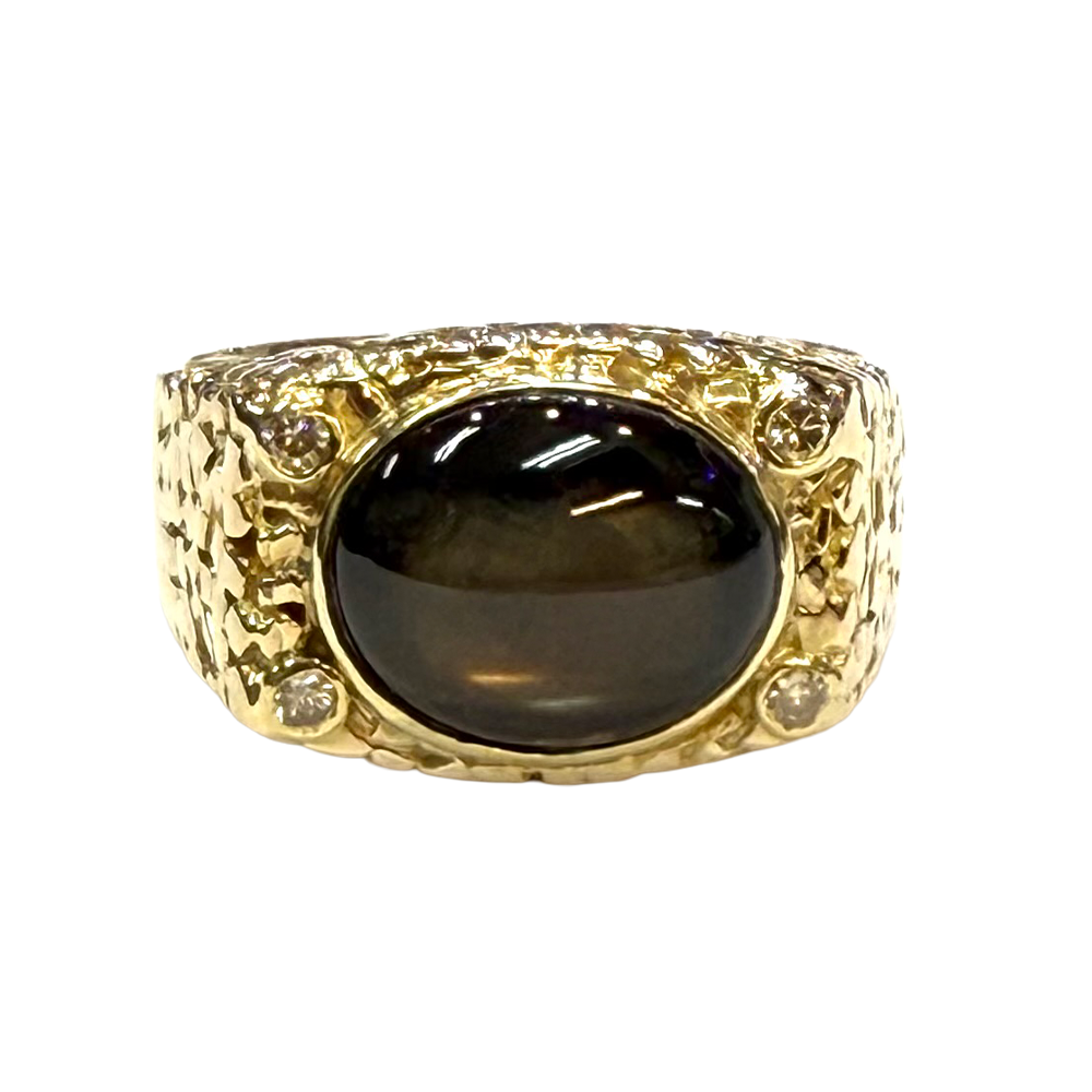 Centering an oval cabochon black star sapphire, weighing approximately 7.00 carats, bezel set, enhanced by 4 round full cut diamonds, weighing a total of .12 carat, bezel set, the ring graduates from 13.00 to 5.30 mm, the bottom section is high polished, all weighing 11.20 grams, ring size 12, preowned in excellent condition.