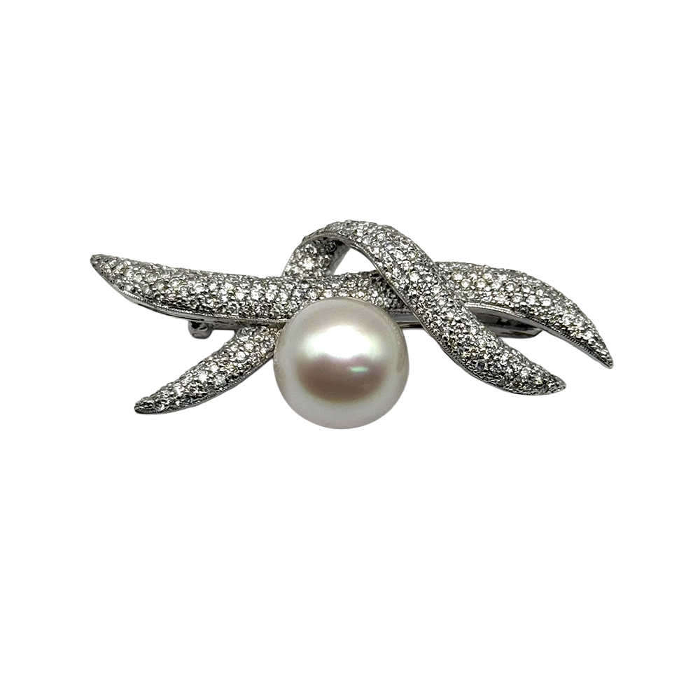 The one of a kind brooch features one south sea pearl, measuring 12.50 mm, enhanced by pave set round brilliant cut diamonds, weighing a total of 2.50 carats, VS to SI clarity, G to H color, measuring 2 1/4 x 3/4 inches, weighing 12.20 grams.