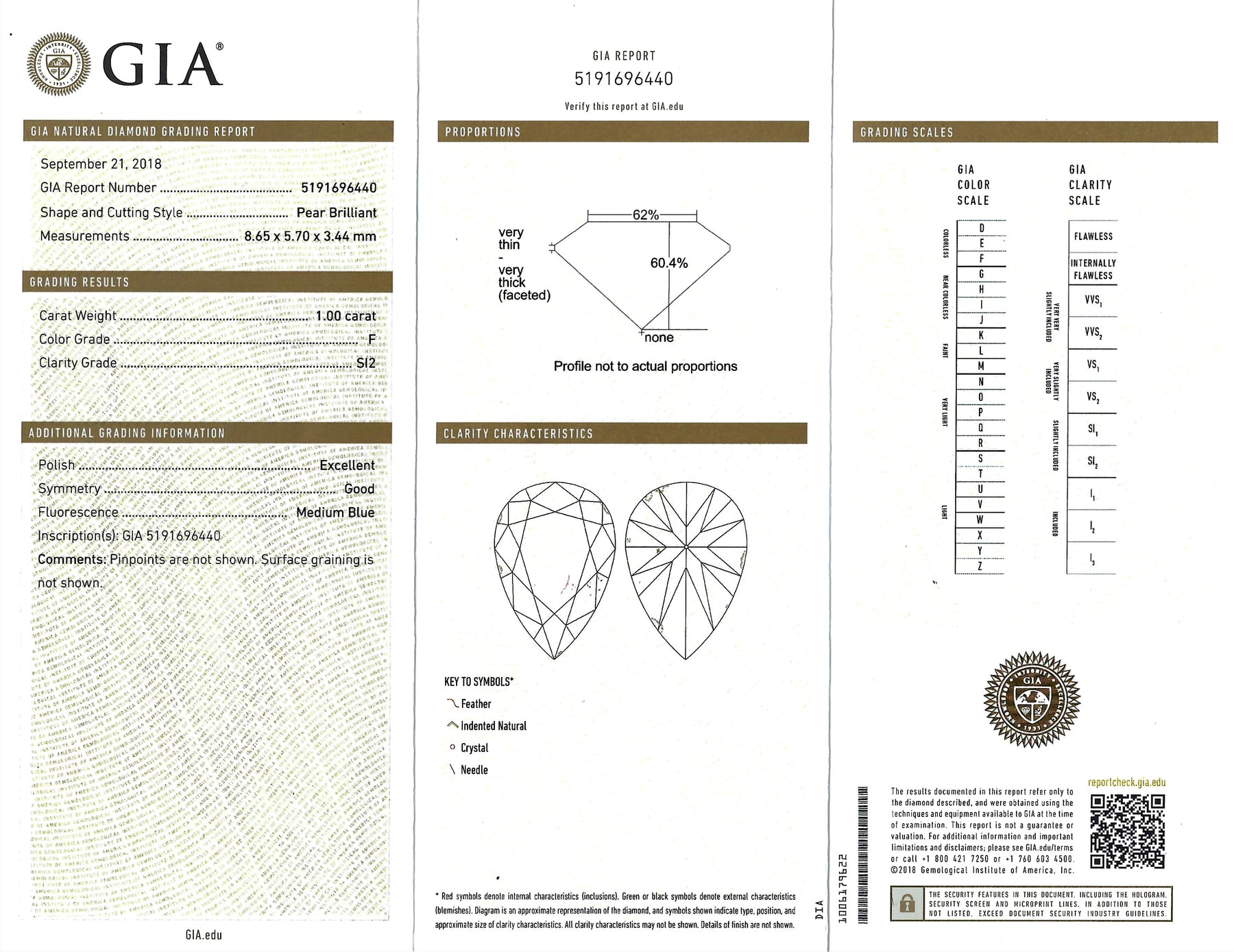 The engagement/wedding ring featuring one pear shaped diamond, weighing 1.00 carat, accompanied by a GIA Diamond Grading Report #5191696440, stating the diamond is F color, SI2 clarity, prong set in a halo design mounting, the halo and band are decorated by 36 round brilliant cut diamonds, weighing a total of approximately .25 carat, VS clarity, G to H color; the matching wedding band is decorated by 21 round brilliant cut diamonds, weighing a total of approximately .20 carat, VS clarity, G to H color, both band are 1.60 mm in width, both weighing 3.60 grams, ring size 6. Note: can be sized.