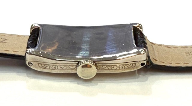 This vintage watch has a 17 jewel Swiss manual precision movement #631604, set into a rectangular case, measuring 22 x 30 mm, inside case marked Cincinnati 117/67, 1134747, having a cream dial with gold Arabic numerals markers, subsidiary seconds dial, both having gold hands, the high polished case is decorated on each side by hand engraving, completed by a brand new black leather strap, the back case weighs 7.10 grams and the top case is approximately 2.50 grams. Note: the watch was just serviced and in good working order.